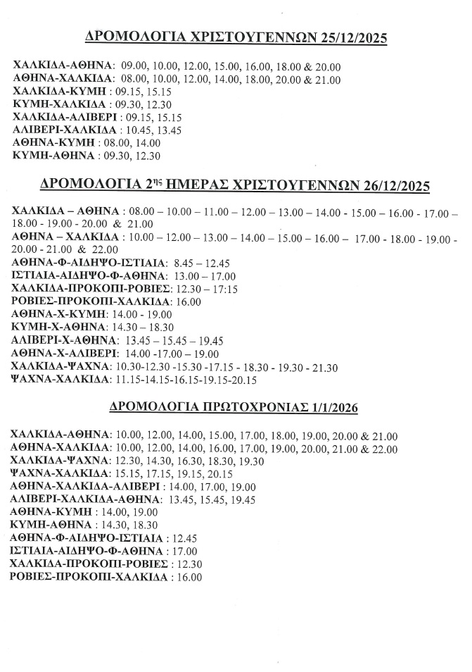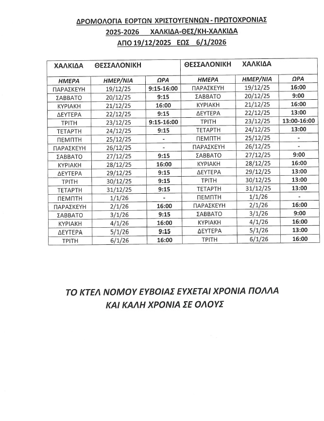 - Πρόγραμμα Χαλκίδα – Θεσ/κη – Χαλκίδα απο 19/12 εως 6/1. (Δείτε εδώ)