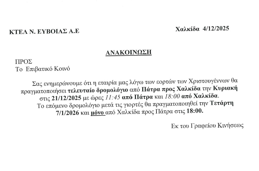 - Ανακοίνωση για δρομολόγια εορτών Πάτρας. (Δείτε εδώ)