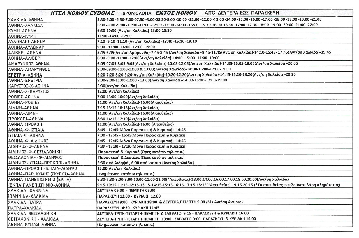 Δρομολόγια Δευτέρα – Παρασκευή Δρομολόγια Σαββάτου Δρομολόγια Κυριακής Δρομολόγια από Αθήνα προς Κυμάσι για Σκιάθο-Σκόπελο-Αλόννησο Δρομολόγια Παραλία Κύμης-Σκύρου-Αλοννήσου-Σκοπέλου Δρομολόγια ΕΚΠΑ Συγκρότημα Ευρίπου ΔΡΟΜΟΛΟΓΙΑ CAMPING ΑΓ.ΑΝΝΑΣ Δρομολόγια Εντός Νομού (Δείτε εδώ)Δρομολόγια Εκτός Νομού (Δείτε εδώ)Τελευταία ενημέρωση: 5/11/2025 Προσθέστε Εδώ το Κείμενο Επικεφαλίδας σας