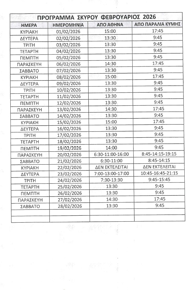 Δρομολόγια Δευτέρα – Παρασκευή Δρομολόγια Σαββάτου Δρομολόγια Κυριακής Δρομολόγια από Αθήνα προς Κυμάσι για Σκιάθο-Σκόπελο-Αλόννησο Δρομολόγια Παραλία Κύμης-Σκύρου-Αλοννήσου-Σκοπέλου Δρομολόγια ΕΚΠΑ Συγκρότημα Ευρίπου ΔΡΟΜΟΛΟΓΙΑ CAMPING ΑΓ.ΑΝΝΑΣ ΔΡΟΜΟΛΟΓΙΑ ΑΘΗΝΑ-ΣΚΥΡΟΣ-ΑΘΗΝΑ-ΦΕΡΒΟΥΑΡΙΟΣ2026 – Δείτε εδώ. ΔΡΟΜΟΛΟΓΙΑ ΑΘΗΝΑ-ΣΚΥΡΟΣ-ΑΘΗΝΑ-ΙΑΝΟΥΑΡΙΟΣ 2026 – Δείτε εδώ.